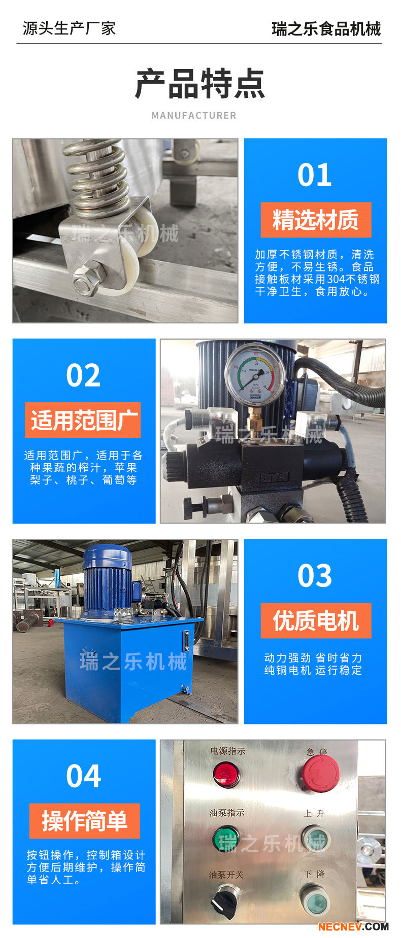 脆皮压榨机厂家,液压式压榨机结构特点包括驱动装置、进料装置、压榨装置、滤网、出料装置和控制系统等。其中,驱动装置提供动力,进料装置将物料均匀分布在滤网上,压榨装置实现对物料的压榨,滤网起到过滤的作用,出料装置将压榨后的固体物排出,控制系统则实现整个设备的自动控制。这种设计使得带式压榨机能够高效地进行物料的脱水处理。压榨机的应用领域广泛,包括但不限于薯渣脱水、果汁压榨、椰糠压榨等,特别是在果蔬饮料行业,特别适用于苹果、梨、番茄等水果的果汁榨取工作。