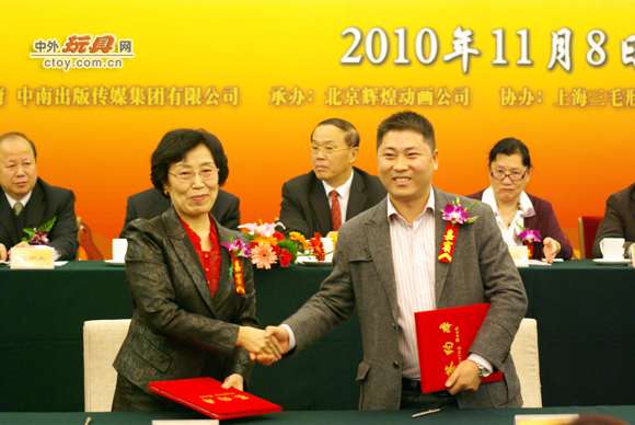 丹妮玩具总经理崔兵(右)与CCTV北京辉煌动画公司总经理周凤英女士在人民大会堂签订合作协议