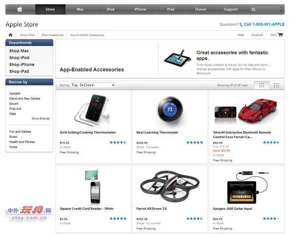 例如,我们在苹果公司的网上商店里可以找到独立开设的“支持APP 的配件”类目,销售的产品包括香港银辉公司的“智能蓝牙遥控法拉利ENZO跑车”以及法国PARROT公司的新款四螺旋桨飞行器AR.DRONE 2.0。