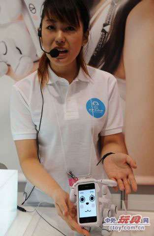 6月14日,在日本东京,一名展台工作人员介绍一款与智能手机搭配的“智能宠物”玩具狗。