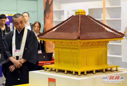6月14日,在日本东京,日本岩手县中尊寺的一名僧侣观看用“乐高”积木搭建的世界文化遗产??平泉文化遗址的中尊寺金色堂建筑。