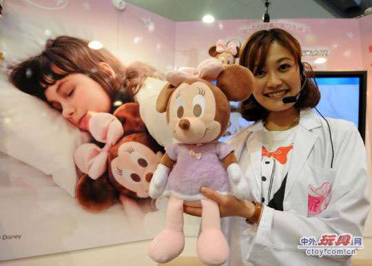 6月14日,在日本东京,一名展台工作人员介绍儿童催眠玩具。