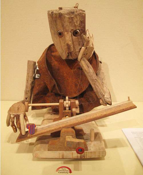 很幸运的是,我们在巴斯正巧赶上了英国木头玩具大家Robert Race的作品展览。他的作品非常有趣,全部都是automata toys,可互动的玩具,他在开篇的介绍里说,“我希望我的玩具的外表能作为一件雕塑品而存在,但是是运动给予他们生命,如果你只是把他们看成静止的作品,那你就错过了最重要的部分。”