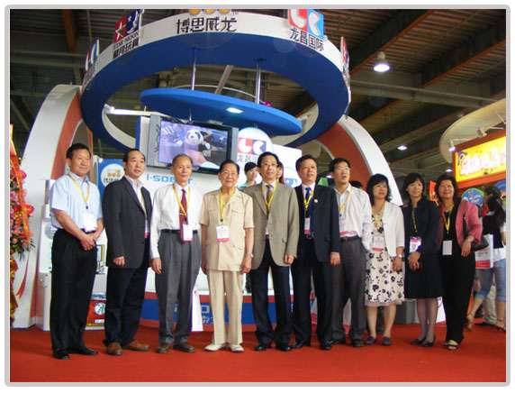 图一 第二十届广州国际玩具展嘉宾和领导合影 (左起依次是广东玩具协会第二任会长杨大行先生、龙昌国际梁钟铭总经理、广东玩具协会创始会长杨开茂、广东原省长匡吉、东莞英德傅慧任总经理、现广东玩具协会会长崔辛湘、星月梁钟琦总经理和企业嘉宾)