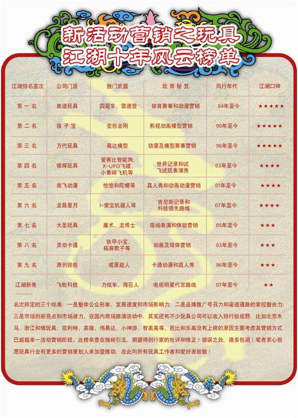 回味玩具行业十年国内的活动营销,不妨斗胆仿百晓生兵器排行谱和胡润先生的中国富豪排行榜,草拟一个江湖活动营销排座,让各位行家点评指证,并期望玩具界的营销方家和实业掌门们共同来推动夺取这个江湖牌匾。