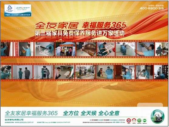 全友家居“幸福服务365”品牌建设的脚步仿佛从不会停歇。2011年4月,全友家居再次重拳出击,带领全国3000余家专卖店大力开展“家具免费保养服务进万家”活动,截至去年8月,该项活动已经成功开展两届,全友家居各专卖店按照一系列标准的服务流程和让消费者认可的感动服务,铸就了家居行业的服务标杆。