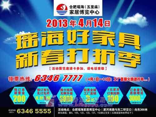 从4月1日至14日,合肥瑶海(五里庙)家居博览中心牵头与300家具品牌厂家联合举办的一次(工厂价直销)盛会,活动期间商场统一票据、统一收银,确保消费者权益!具体的活动方法是:消费者打电话索取邀请卡,4月1日至13日为预订时间,14日为现场抢购活动时间。