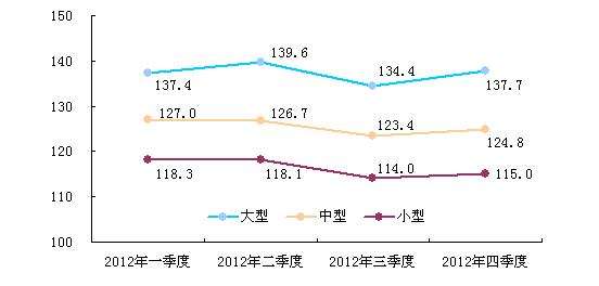 分企业规模看,大、中、小型企业景气指数分别为137.1、124.8、115.0,分别比三季度上升2.7点、1.4点和1.0点。调查结果表明,大型企业景气回升相对较快,小型企业景气回升相对较慢,规模景气差异更趋明显。