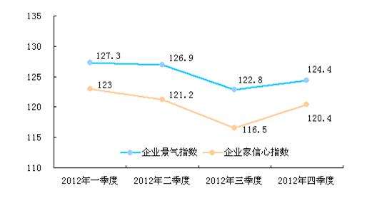 2012年四季度企业景气指数为124.4,比三季度上升1.6点。其中,反映企业当前景气状态的即期企业景气指数为124.1,比三季度上升4.4点;反映企业未来景气预判的预期企业景气指数为124.6,与三季度基本持平(微降0.2点)。四季度,企业家信心指数为120.4,比三季度上升3.9点。