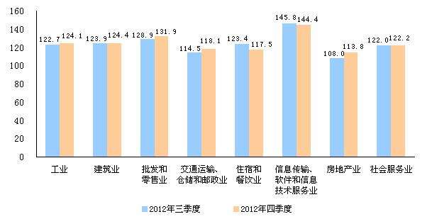 分行业看,按企业景气指数高低排序依次是信息传输软件和信息技术服务业、批发和零售业、建筑业、工业、社会服务业、交通运输仓储和邮政业、住宿和餐饮业、房地产业,企业景气指数依次为144.4、131.9、124.4、124.1、122.2、118.1、117.5、113.8。与三季度结果相比,房地产业、交通运输仓储和邮政业、批发和零售业、工业、建筑业、社会服务业分别回升5.8、3.6、3.0、1.4、0.5、0.2点;住宿和餐饮业、信息传输软件和信息技术服务业分别回落5.9、1.4点。