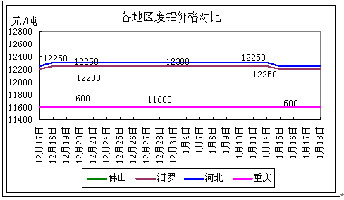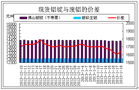 本周铝价跟随沪铝小幅波动,截至周五,佛山铝锭(不带票)价格维持在14290-14390元/吨左右,较上周下跌70元/吨,破碎生铝报价在12600-12800元/吨左右,与上周持平。本周世界金属统计局公布的数据显示2012年前11个月全球铝市供应过剩365,100吨,虽相对于2011年过剩量有所减少,但依旧难改供目前铝市供应过剩的现状。而从近期市场的交易情况来看,下游企业目前采购备货的力度并不是很大,折射出市场需求不旺的疲态。使得铝价目前仍处在两年多来的低位,从目前市场各个方面来看,下周铝价再次大跌的可能性还是较低,料下周沪铝依旧维持小幅震荡的行情。本周铝锭价格有所下跌,使得现货铝锭与废铝的价差有所收窄1650左右。其对废铝的利好有所减弱。