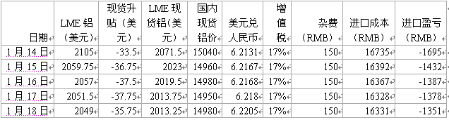 表2:铝现货进口成本及盈亏
