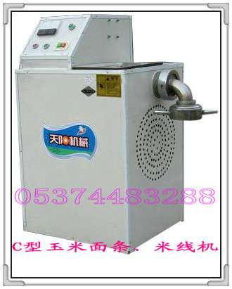 粗粮细吃,吃的是健康,吃的是时尚。食品权威人事一致认为,杂粮米粉、杂粮面条、杂粮粉丝产业将是21世纪最具有发展前途的朝阳产业,是最值得投资的项目。老百姓对绿色杂粮食品需求以每年30%的速度递增,生产利润丰厚。曲阜市天阳机械制造有限公司根据玉米等杂粮的特性,研制生产了新型面食机械--多功能玉米面条机(杂粮面条机),使纯玉米及各种杂粮加工面条成为现实,扩大了粗粮加工种类,迎合了现代人追求科学膳食,粗粮、杂粮、粗细搭配的饮食时尚,为乡镇企业及个体生产经营者、下岗工人创造了市场先机。天阳玉米面条机结构合理,造型美观,采用螺旋分段复合挤压生物变性工艺,将黏性很小的玉米等杂粮面通过玉米面条机综合转化成具有柔韧弹性特点的面条。天阳玉米面条机加工的面条保留原粮的特有营养成分和微量元素,色泽好、劲道耐煮、滑爽细腻、口感鲜美、不糊汤,蒸、煮、炒、涮皆可,加工拌料时加入奶粉、蛋粉、蔬菜汁、蔬菜粉、山药等各种保健原料更能提升营养价值和风味。天阳玉米面条机既可现做现卖,也可制作挂面,进入超市,还可开办玉米快餐面加工厂,是厨房,饭店,面条加工户的理想食品加工设备。天阳玉米面条机TYG-A时产50-60公斤,动力2.2KW(220V),价格2300元,TYG-C型时产100-120公斤,动力7.5KW,价格3600元,TYG-D型时产150-200公斤,动力7.5-11KW,价格7580元。另可根据客户需要配备玉米脱皮机,磨粉机,拌面机等。