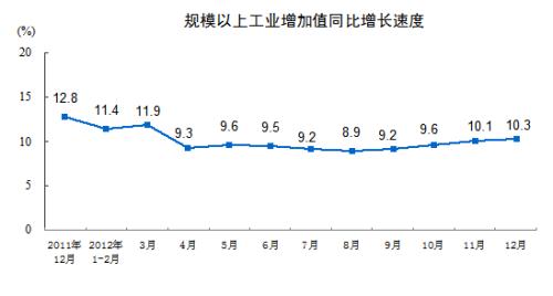 2012年12月份,规模以上工业增加值同比实际增长10.3%(以下增加值增速均为扣除价格因素的实际增长率),比11月份加快0.2个百分点。从环比看,12月份,规模以上工业增加值比上月增长0.87%。1-12月份,规模以上工业增加值同比增长10.0%。