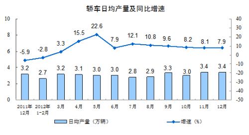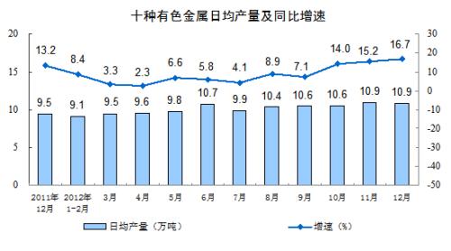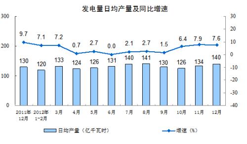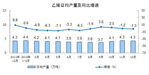 分产品看,12月份,471种产品中有334种产品同比增长。其中,钢材8138万吨,增长13.5%;水泥18180万吨,增长5.4 %;十种有色金属338万吨,增长16.7%;汽车191.7万辆,增长5.3%;轿车104.8万辆,增长7.9%;发电量4327亿千瓦时,增长7.6%;原油加工量4312万吨,增长8.4%;乙烯133万吨,下降1.3%。