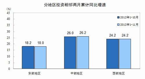 分地区看,1-11月份,东部地区投资153209亿元,同比增长18%,增速比1-10月份回落0.2个百分点;中部地区投资91538亿元,增长26.2%,加快0.2个百分点;西部地区投资78432亿元,增长24.2%,增速与1-10月份持平。