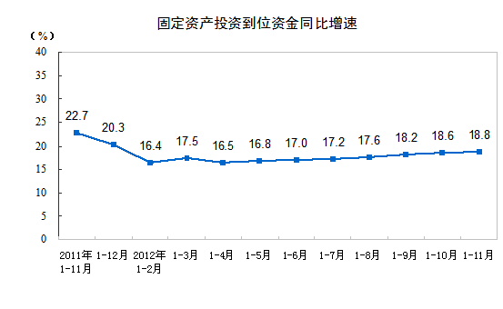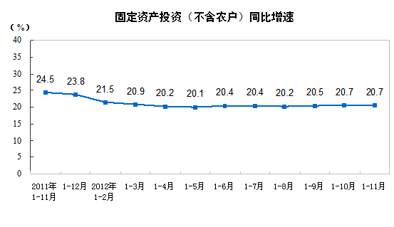 2012年1-11月份,全国固定资产投资(不含农户)326236亿元,同比名义增长20.7%,增速与1-10月份持平。从环比看,11月份固定资产投资(不含农户)增长1.26%。