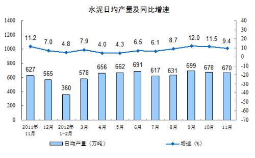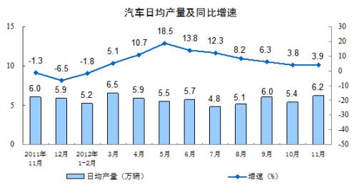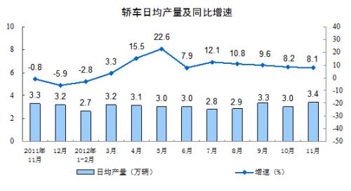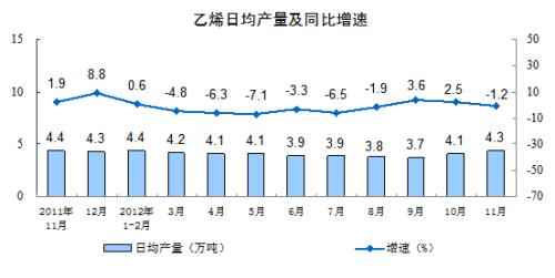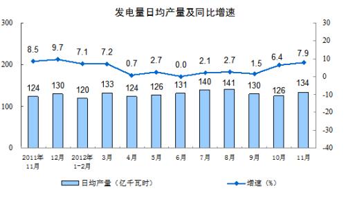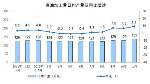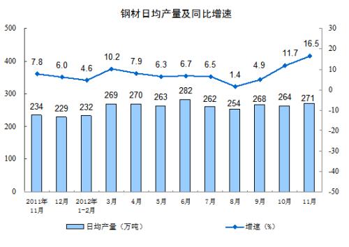 分产品看,11月份,471种产品中有339 种产品同比增长。其中,钢材8123万吨,增长16.5 %;水泥20108万吨,增长9.4 %;十种有色金属328万吨,增长15.2%;汽车184.9万辆,增长3.9%;轿车103.0万辆,增长8.1%;发电量4011亿千瓦时,增长7.9%;原油加工量4161万吨,增长9.1 %;乙烯129.8万吨,下降1.2 %。