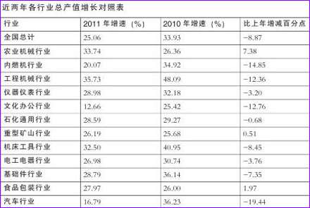 增速略降 机械工业上年既定目标基本实现 2011年机械工业十二个行业生产均呈增长势头,九个行业增速高于行业平均水平,依次是:工程机械、农业机械、机床工具、仪器仪表、机械基础件、石化通用、食品包装、电工电器和重型矿山行业,其中农业机械行业受国家政策支持,增长突出,2011年工业总产值增长33.74%,比上年26.36%的增速加快7.38个百分点。工程机械行业工业总产值增长35.73%,位列首位,但其增速比上年同期48.09%的增速下滑12.36个百分点(见表)。