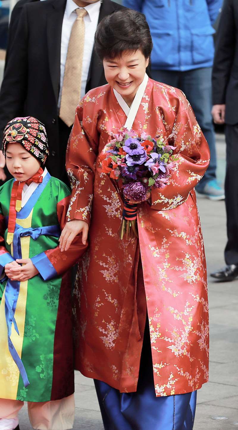 25日,身穿鲜红色传统礼服的朴槿惠来到光华门广场。