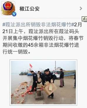 22日9时许,浙江台州市公安局椒江区分局官方微博“椒江公安”发布一条关于处理非法烟花爆竹的消息,称分局一派出所将春节期间收缴的45余箱非法烟花爆竹进行同一销毁。同时,微博配图显示,几名公安***正将非法烟花爆竹投进江中。该微博发布后,不少网友质疑:“让大海销毁烟花是否得当?”“这样对水质难道没有影响?”……