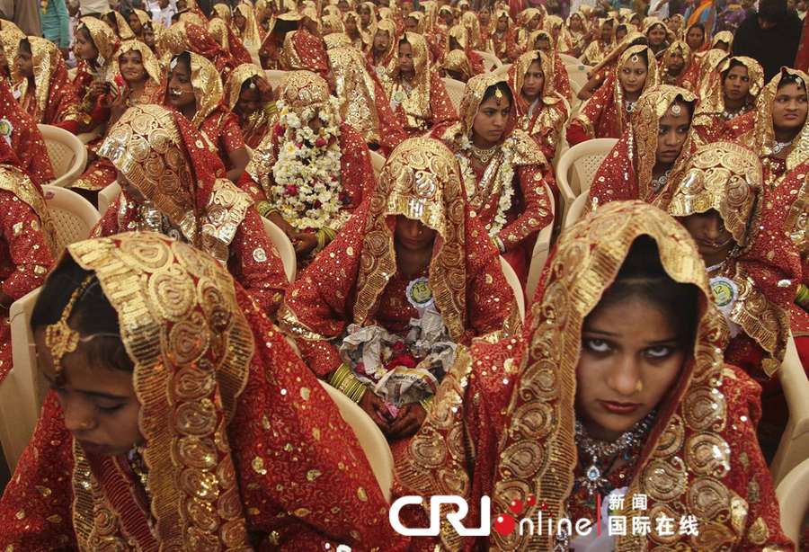 国际在线消息:当地时间2013年2月22日,印度艾哈迈达巴德,151对贫穷穆斯林新人举行集体婚礼。图片来源:Ajit Solanki/东方IC