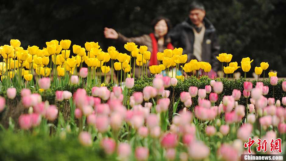 2月17日,重庆花卉园里的郁金香开的非常繁茂。在阳光的照射下,艳丽的郁金香吸引不少市民前来观赏、拍照留念。重庆市气象部分透露,一月中旬以来,冬季风减弱,影响重庆的北方冷空气偏弱,导致该市回热较快,重庆大部地区较常年提前进春。图为市民正在观赏郁金香。陈超 摄