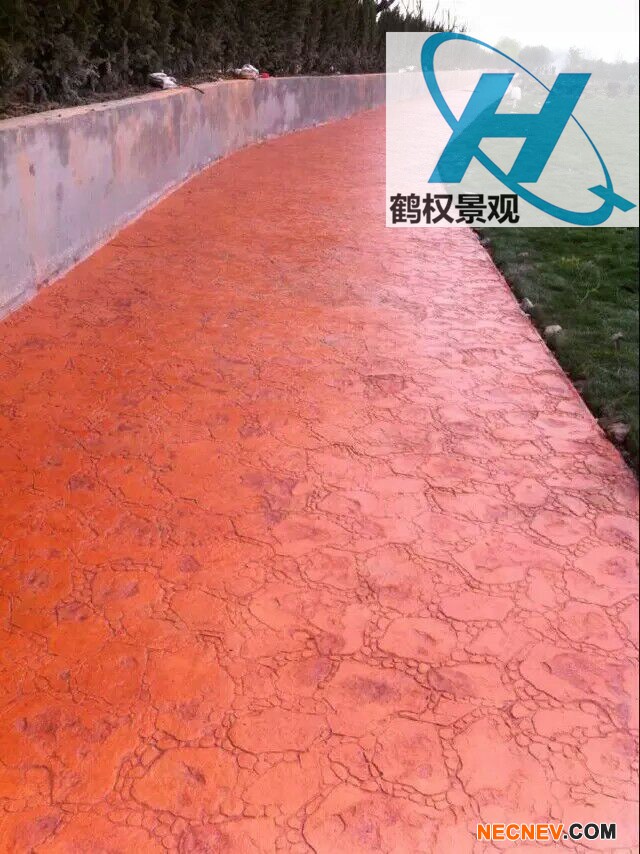 3. 混凝土初凝前,以镘刀将混凝土镘平,以撒布法将彩色印花料按规定用量平均分二至三次均匀撒布于混凝土面层,每次均匀以专用镘刀进行镘平、镘光工作。