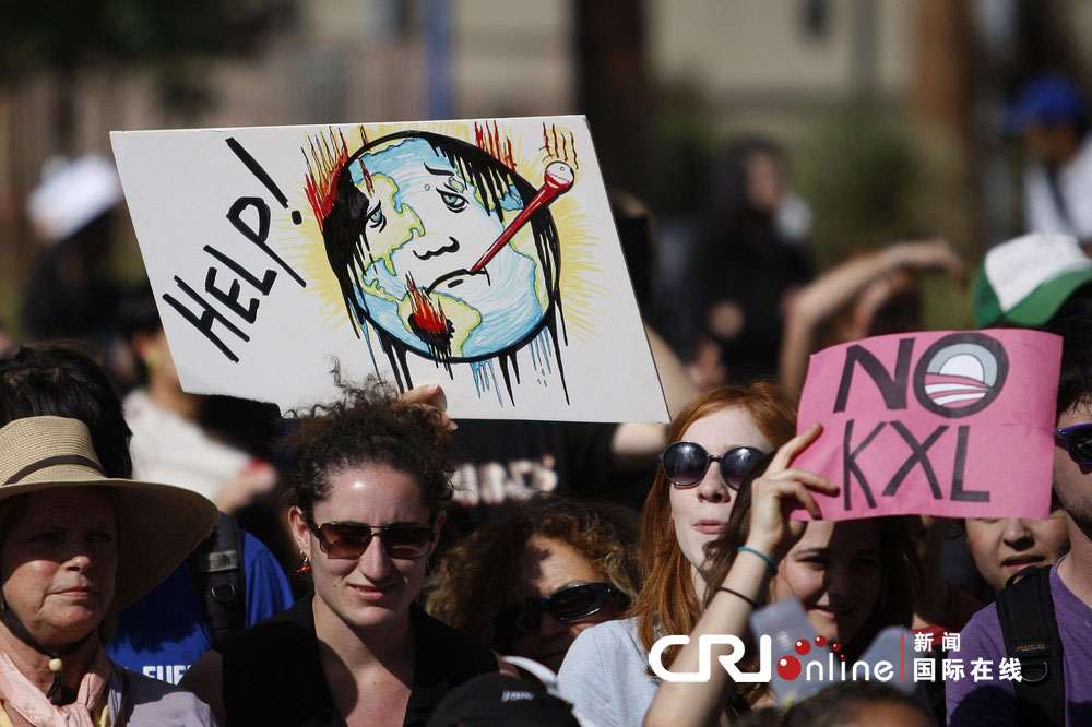 当地时间2013年2月17日,美国加州洛杉矶,示威者集会要求总统奥巴马采取切实措施,来应对全球变热。***者希看奥巴马拒尽从加拿大输送石油的管道建设计划,命令环境保护局为发电厂设置炭标准。组织者称,奥巴马的政治遗产取决于他在应对天气破坏上的领导力。根据组织者称,类似的集会在华盛顿和美国其他城市也同时举行。图片来源:David McNew/GettyNorthAmerica/CFP