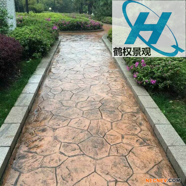 3. 混凝土初凝前,以镘刀将混凝土镘平,以撒布法将彩色印花料按规定用量平均分二至三次均匀撒布于混凝土面层,每次均匀以专用镘刀进行镘平、镘光工作。