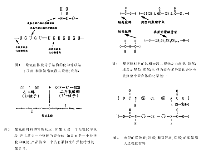 聚氨酯橡胶在单分子的水平上,通过碳原子、氢原子、氮原子、和氧原子这四种普通原子的化学作用而生成。所有聚氨酯橡胶都包括聚氨酯化学键(NHCO2),该化学键将异氰酸酯(NCO)和羟基(OH)联结起来。实际的聚氨酯材料是一种软相嵌段和硬相嵌段交替排列的共聚物(参见图1)。硬相嵌段是一个二异氰酸酯和一个短链二醇通过反应而形成的。这种聚氨酯化学键的结合力相当强大,在结构上表现为重复结构的二异氰酸酯和短链二醇(或者是化学链延长结构)化学键链接。软相嵌段具有柔韧性,通常是由醚类或酯类多羟基化合物分散到整个聚合体化学链结构中,联结到具有聚氨酯化学键的宏分子上。这些具有柔韧性的软相嵌段在结构上表现为重复结构的二异氰酸酯和长链二醇(或者多羟基化合物)(参见图2)。