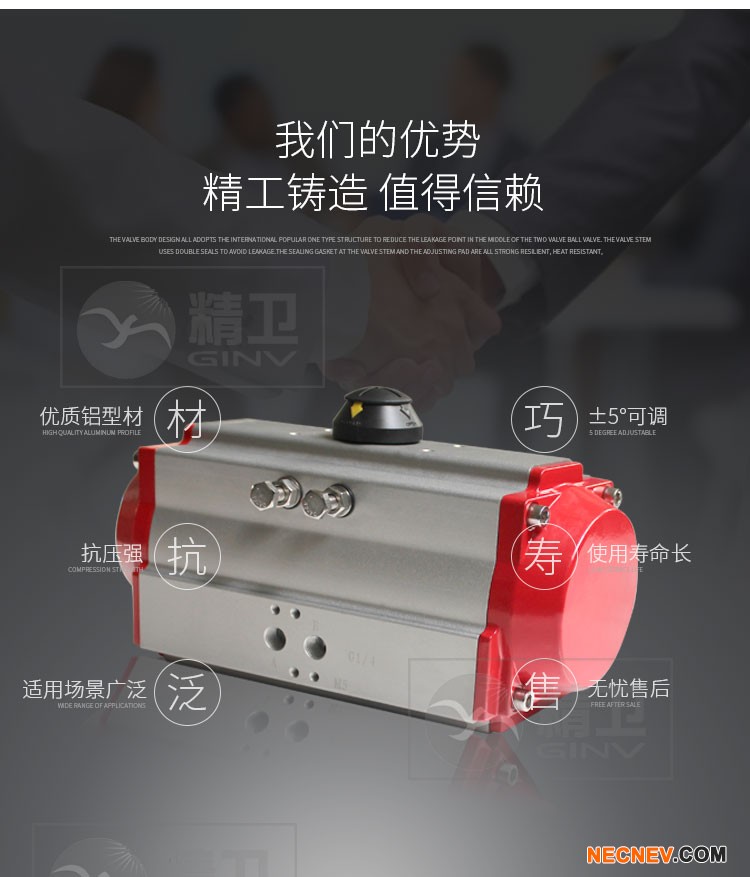 portant;">AT气动执行器是将输入的气压信号转换成90度,再以扭转矩形形式输出的执行机构。该系列气动执行器是一种外型小、性能高的的执行结构,分为双气控型和单气控型两种,与角行程型控制阀组合可用于调节和开关的场合,也可用于其他回转运动的场合。