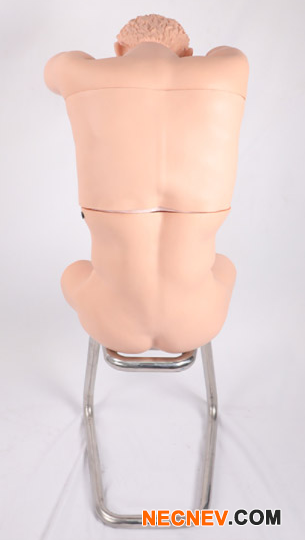 ■ 仿真标准化病人反向坐于靠背椅上,双臂平置,形象逼真。