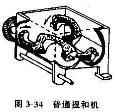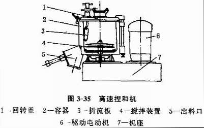 (2)高速捏和机:又称强力混合器,如图3-35所示。它由一个密闭的圆筒形混合室及其底部高速旋转的叶轮组成,混合室同样有加热用的夹套,加热介质为蒸气或油。物料由混合室上部投入,由于离心力的作用物料从底部沿侧壁向上旋转至中心部位落下,叶轮高速旋转,物料便如此上升、下降,剧烈运动,相互掸击,从而达到均匀混合的目的。