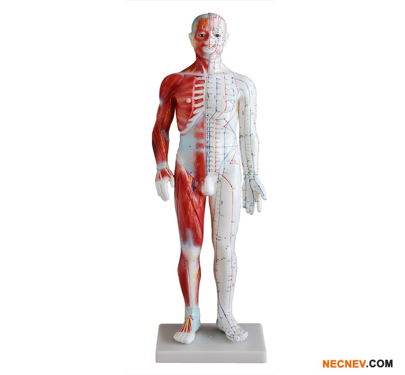 这款针灸模型非常详细地标明了14条主要经络线,身体右侧是361个经穴和48个经外穴以及骨度线,即用“寸”来方便地测量针灸点之间的距离。身体左侧是皮下组织,显示神经系统分布、动静脉、血管和肌肉构造,还标明了在主要经络线上没有标明的手足部的经外穴。适用于中医教学、针灸和推拿等。用PVC制成。