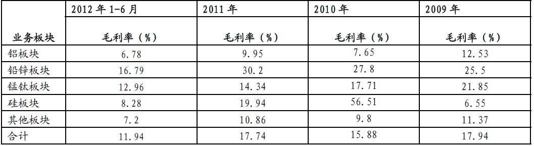 2009年-2011年及2012年1-6月,营业收入毛利率分别为17.94%、15.76%、17.61%和11.81%,较为稳定,成本控制到位。而分版块看,在今年1-6月,各版块毛利率全线下降,铅锌板块毛利率为16.79%,较2011年下降13.4个百分点,下降最为明显。