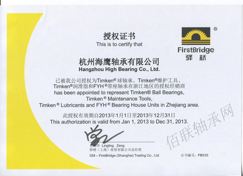 2013年,杭州海鹰轴承有限公司继续获得驿桥(上海)商贸有限公司授权(证书编号:FB033),成为Timken球轴承、Timken维护工具、Timken润滑脂、FYH带座轴承浙江地区授权经销商,有效期自2013年1月1日至2013年12月31日。如今,杭州海鹰轴承有限公司已经成为驿桥(上海)商贸有限公司的核心经销商之一。