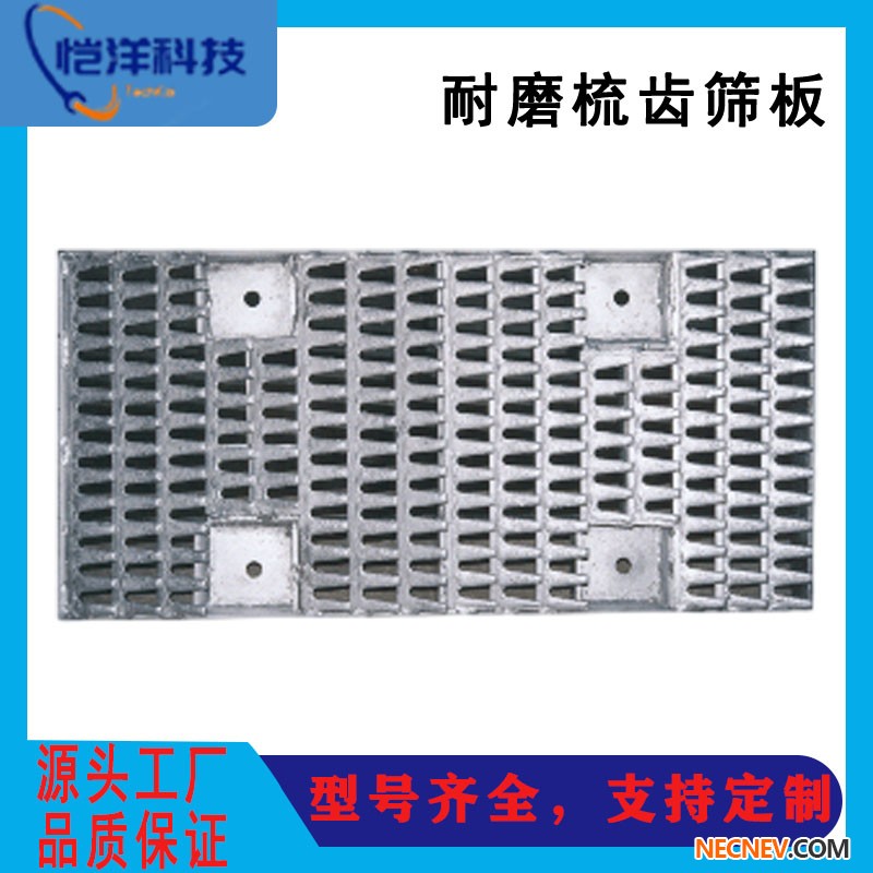 耐磨梳齿筛板是我公司自行开发的应用广泛的主导筛板产品,该筛板具有不堵塞、筛分效率高、更耐磨的显著特点,适用于煤炭、冶金、化工等行业烧结、熟料、焦煤以及各种生块矿石等硬度较高、重量较大的干物料,该筛板根据选用材质不同,可以达到不同的使用寿命。