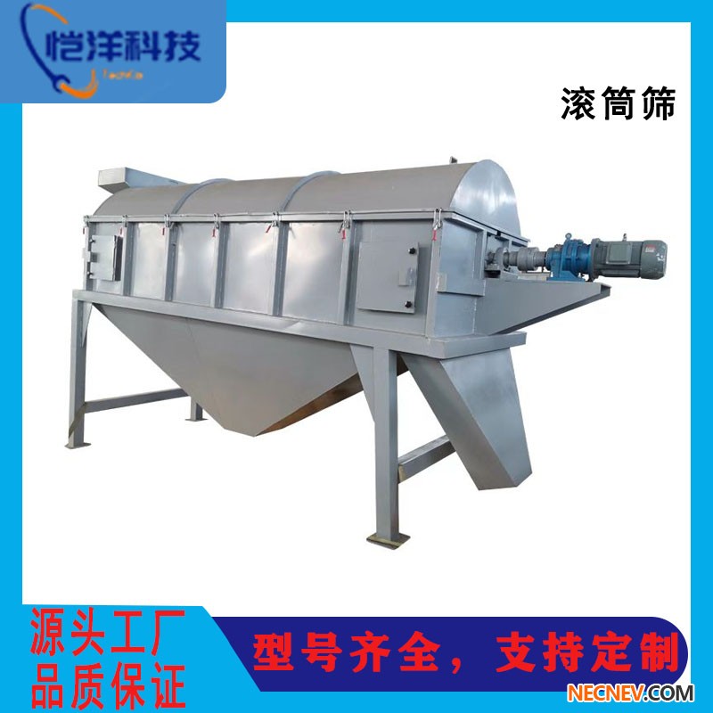 电动机经减速机与滚筒装置通过联轴器连接在一起,驱动滚筒绕其轴线转动。当物料进入滚筒装置后,由于滚筒装置的转动滚筒(可倾斜),使筛面上的物料翻转与转动,使合格物料经滚筒后端底部的出料口排出,不合格物料经滚筒尾部的排料口排出。由于物料在滚筒内的翻转,滚动,使卡在筛孔中的物料可被弹出,防止筛孔堵塞。