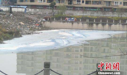 日前,网友发微博爆料,1月6日上午,鹿城区双屿街道卧旗大河卧旗水闸上游百余米的河段漂浮着密集的白色泡沫,污水呈蓝白相间的带状渐变色。