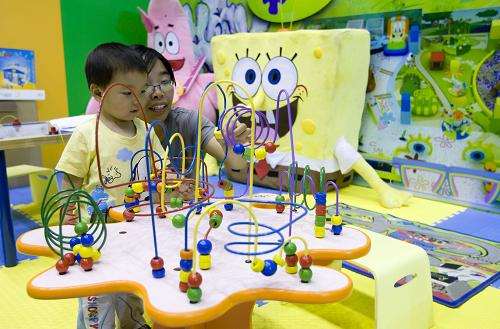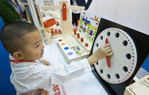 5月17日,小朋友在北京举行的第14届北京国际玩具及幼教用品展览会上体验益智类幼儿玩具。当日,为期3天的第14届北京国际玩具及幼教用品展览会在北京中国国际贸易中心开幕。本次展会展出面积15000平方米,吸引了来自国内外近400家玩具幼教企业参展,环保和高科技含量的玩具成为本次展会的亮点。新华社发(赵冰 摄)