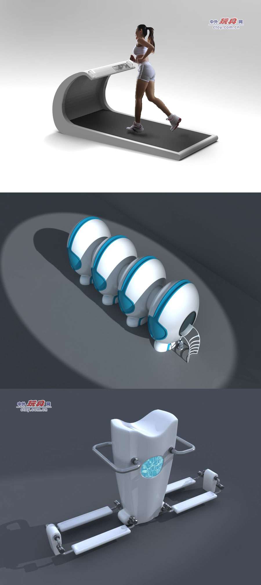 成人的健身娱乐器械的设计,整个设计主要以简约科技为主,蛋形组合滑梯、走步机、跑步机。