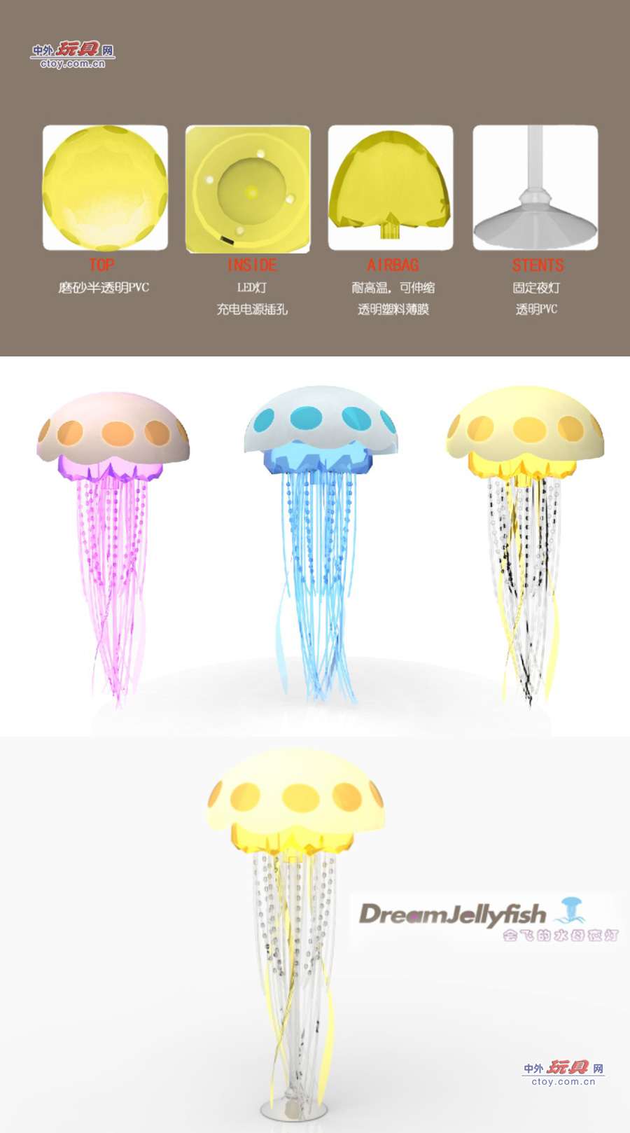 设计说明:水母轻盈通透,柔美纯净,犹如深海中优雅动人的舞者,给人一种安静祥和的感觉。有些能够发光的水母在暗海中跳动闪烁姿态,犹如一个个挥动的光点,有非常高的观赏性和调节情趣的作用。而在现实生活中,我国传统的孔明灯,就形似漂浮的水母一样,寄托了人们美好的愿望与梦想。作品将美丽的水母与夜灯融合,不仅展示了水母妙曼婀娜的身姿,并结合氢气球的漂浮原理,使夜灯能够漂浮在空中,打破了传统的灯具设计,不在使其局限于固定的空间,完美的水母的特色展现出来。水母灯采用触碰式开关,灯体内有感应装置,用手轻轻碰触水母灯的灯罩即可。电源为充电式,简化造型,使其更加完整独立。灯体的总重力与气囊部位的氨气混合物浮力基本相等,总重力为零,不使用的时候可固定在支架上。当灯打开后,气体受热膨胀,浮力上升,水母灯漂浮起来。由于LED灯的散热量有限,气体膨胀系数有限,在使用状体下灯的浮力高度约为1.5米~2米,能够安全使用。