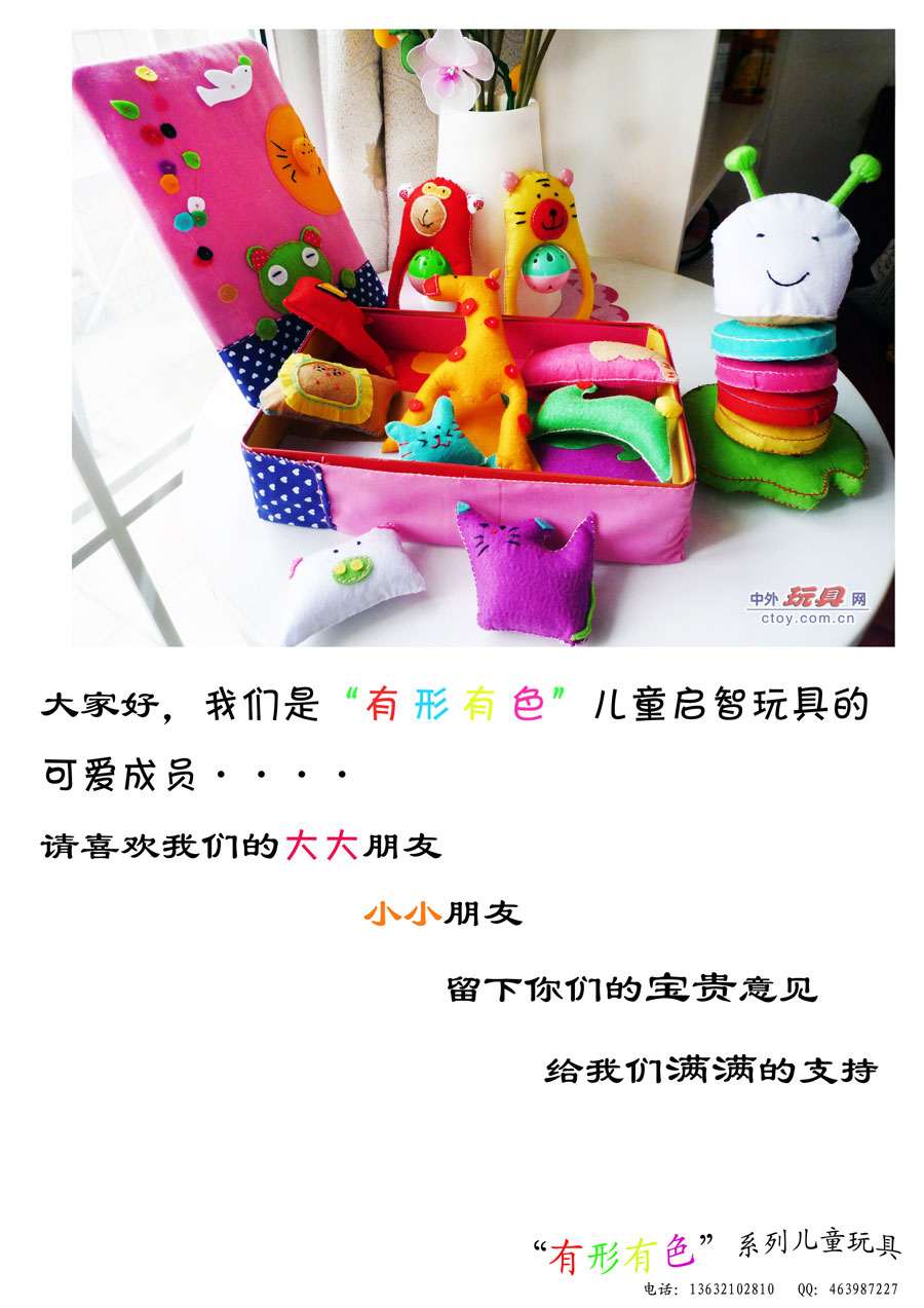 设计说明:“有形有色” 系列儿童玩具包括三个成分(1)摇摇乐:由乐乐虎和皮皮猴组成。婴幼儿时期的孩子对色彩与声音的感觉最为敏感,摇摇乐利用老虎与猴子的形象,手工布艺制作,色彩艳丽,可爱大方,声音清脆。(2)玩偶拼图:依据玩偶的形状与色彩完成拼图,操作简单。拼图玩具在市场上很多见,但这款玩偶拼图是使动物形象简单化,儿童在玩的过程中既认识了形状色彩,有了解了动物世界的科学知识,采用布艺手工制作材,安全可靠。
