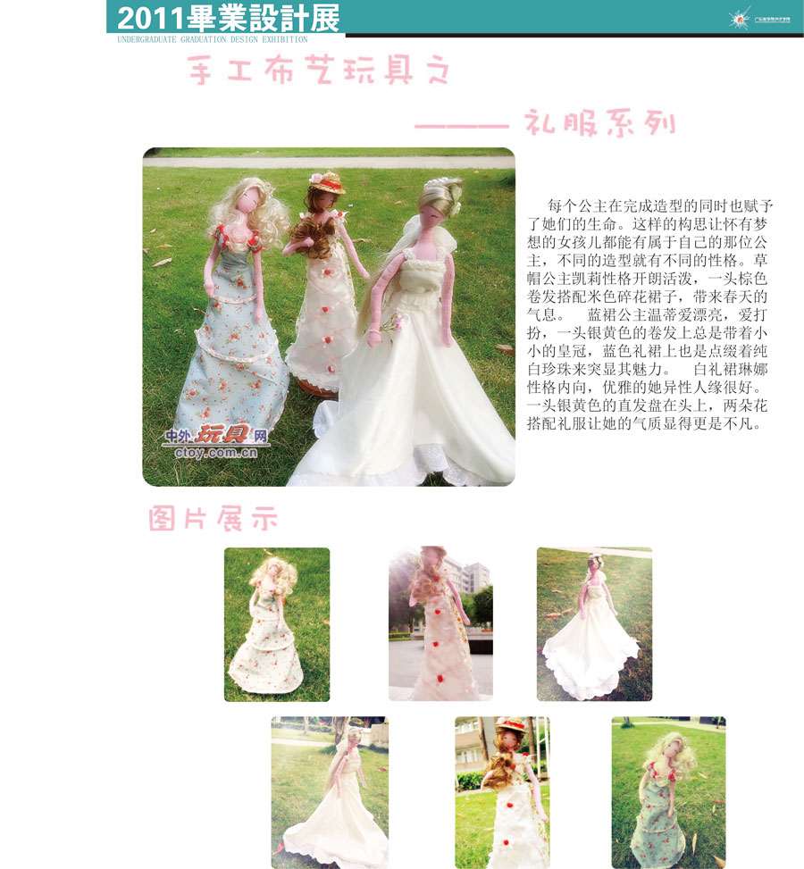 设计说明:每个女孩儿都有一个公主梦,从灰姑娘到白雪公主,美丽的外表善良的内心,还有那些华丽漂亮的礼服,都是女孩儿的梦。此设计理念围绕华丽礼服为主题元素,结合纯手工缝制,塑造了三个不同性格不同造型的公主。而每个公主在完成造型的同时也赋予了她们生命。这样的构思让怀有梦想的女孩儿都能有属于自己心里的那位公主。玩具的选材采用了不同的布料,结合复古的礼服和造型让玩偶活灵活现,九头身的比例,加上华丽的礼服,让公主的魅力完美表现。此设计最终则是观赏性,收藏性的,给布艺手工爱好者很好的视觉冲击。设计者会从细节上面给予玩偶不一样的效果,仿佛给她们生命一样的效果。主题紧紧围绕DIY、环保、华丽、观赏性来出发,制作出不一样风格的玩偶。