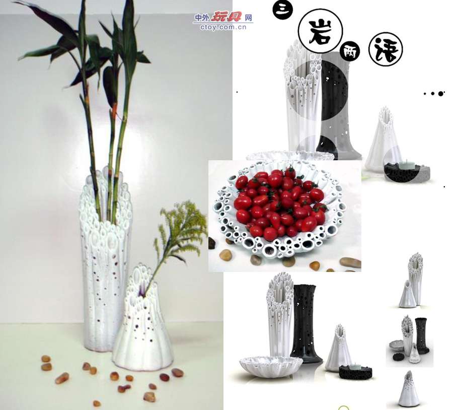 设计说明:系列办公装饰品包括花瓶、果盘、烛台、地灯。“三‘岩’两语” 是用来说明我的设计想通过一种简洁的表现手法将岩石的自然清新、淳朴仿生的一面展示出来,将自然形态转化为赋予生命力和情趣的设计,从而创造出有生命力的作品。具体就是希望使产品的外部形式力求真正诉出“岩语”。系列作品中将抽象过来的岩石那种代表自然的纹理与颜色传达出来,让人们感到置身于自然,把自然带回家,进而彰显家的舒适与温馨。