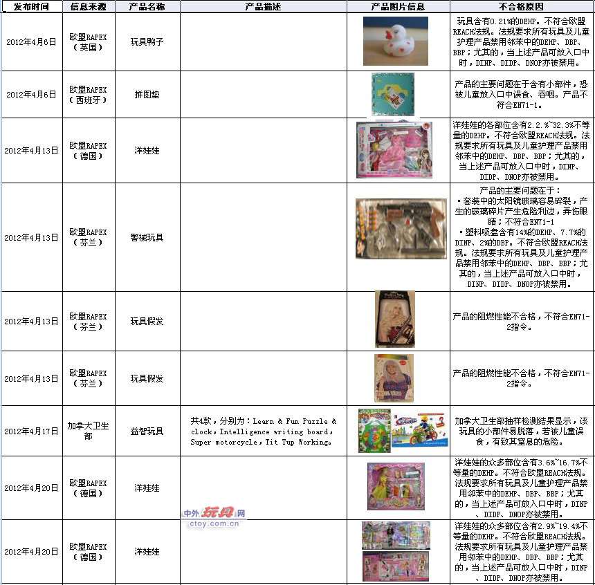 在刚刚过去的4月份,欧盟、美国及加拿大针对中国产玩具共发起了23宗消费者警告、召回。 中外玩具网记者从WTO信息检验检疫信息网日前发布的一份《境外通报我国不合格产品信息》文件获悉,4月份,23个型号的中国产玩具由于各种原因受到通报,涉及的玩具种类包括塑胶玩具、洋娃娃、拼图垫、婴儿摇铃、儿童推车、遥控玩具等等。 在总共23宗警告召回中,来自欧盟的警告最多,达到20宗;美国消费品安全委员会(CPSC)针对婴儿摇铃、吸管杯发起两宗召回;加拿大卫生部则对一款益智玩具发起了召回。(详情见下表) 为此,中外玩具网建议国内有关玩具生产和出口企业予以高度重视,关注全球最新玩具安全标准(>>进入中外玩具网?“玩具安全标准频道” ),提高产品质量,降低被召回风险。(salas)