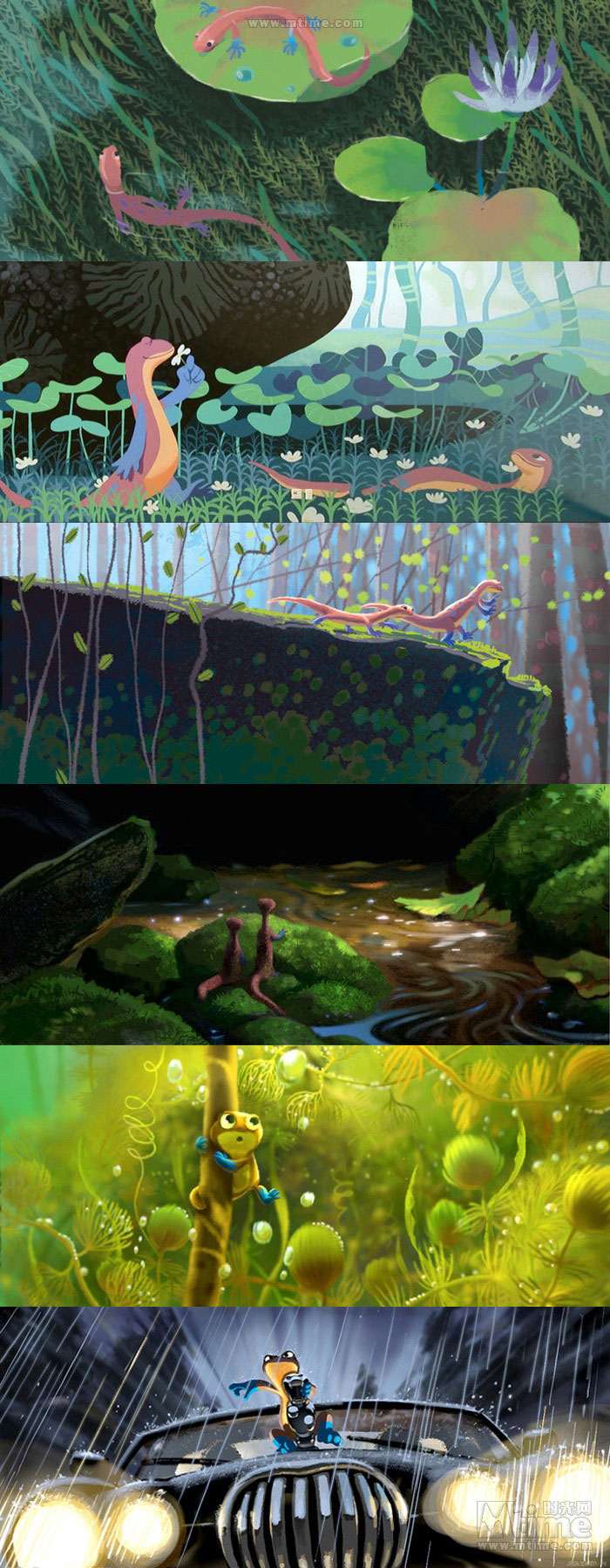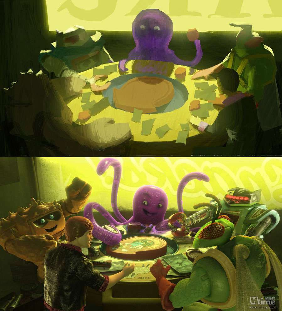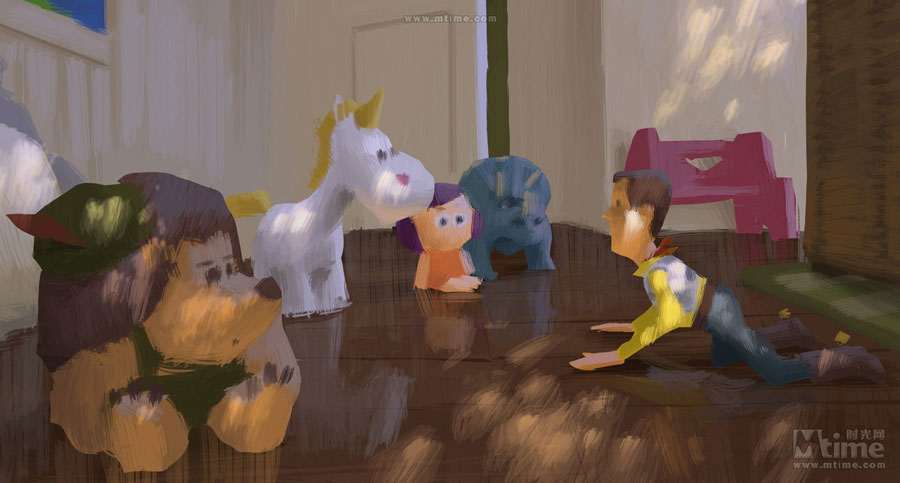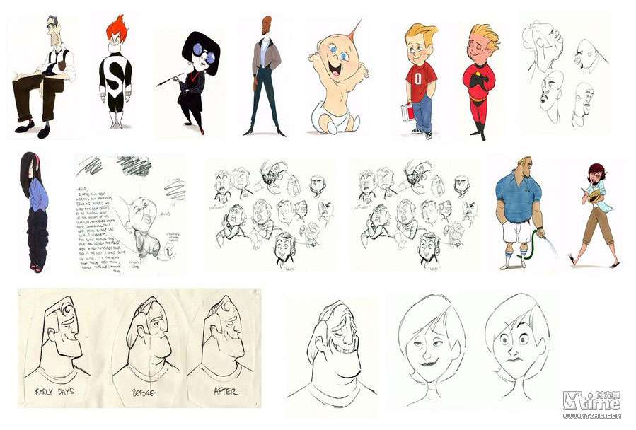 本文将以倒叙的方式,回顾皮克斯留下的一部部经典作品:勇敢传说、玩具总动员3、飞屋环游记、海底总动员、机器人总动员、超人总动员……通过一张张精美的概念图,走进皮克斯的动画世界,领略从草稿设计到绚丽成品的神奇转变。 时光网特稿 由迪士尼出品、皮克斯精心打造的年度动画力作《勇敢传说》即将于6月19日抢先全球登陆中国内地3D银幕。作为皮克斯第13部、也是三年来的首部原创作品,《勇敢传说》还是第一部源自童话故事、并且由女性担当主角同时由女性导演参与执导的皮克斯动画,诸多“第一”令影片意义非凡;而陆续曝光的几批精美概念设计图更是饱含了浓郁苏格兰气息,全新的人设与画风同样令人眼前一亮,也不禁让我们将视线转移到了一部动画的诞生之初:概念艺术(Concept Art)。本专题将带领大家,通过一张张精美的概念图,走进皮克斯的动画世界,领略从草稿设计到绚丽成品的神奇转变。(编者注:由于年代久远、画质欠佳等原因,我们没有收录后来有推出新续集的《玩具总动员1&2》及《赛车总动员1》的概念图,敬请谅解) 一切从“画”开始:概念艺术ABC 正如画一张精细的画作之前需要打草图和小稿一样,概念设计就是在现代视觉娱乐项目(戏剧、游戏和电影)工作流程中,在视觉上的第一步。简单说,概念艺术就是为一个项目的定下最初视觉印象。最初的概念设计已经不可考,它是随着设计行业的发展逐渐形成的概念。但是一般来说,Concept Art这个词汇被行业熟悉,是在二十世纪的30年代的汽车工业中和迪士尼动画产业中。在很长的一段时间中,概念艺术家的工作被定义为“某一个项目的视觉设计工作中创造之前不存在的角色、场景以及其他物品”,所以“概念艺术”这个词汇往往和奇幻科幻相关的作品联系在一起。 随着CG特效和3D动画技术的发展,概念设计对于动画产业的重要性显得尤其明显。无论对于现代全数字的3D动画还是传统的2D动画,第一步都离不开“画”,概念设计师首先要画出主要角色、关键场景、关键帧的粗略画面――虽然只是粗略画面,可以不用画出细节,但是需要定下的是整体印象。拿角色举例,在这一步需要定下角色的性别、年龄、气质、基本体型、服装造型方向和基础配色。之后,有一个叫做“视觉拓展”部门就会基于概念设计的方向,保持原有的艺术造型风格,朝向最终的效果(3D模型或者在最终画面中出现的量化2D的造型),制作出一个标准造型,之后再交给动画师(2D动画)或者建模师(3D动画)往下进行。 艺术气质的奠定者:皮克斯著名画师 虽然现在现代工业流程中的概念设计和传统的画家有了明显的职业分歧,但是要成为概念艺术家,首先要成为画家。在一些影视项目中,制作人和导演会大胆启用一些没有从事过这一行,但是在绘画上有成就的画家来做设计,往往可以收到意想不到的效果,因为一个好的概念设计师,对整部动画的气质走向有很重要的影响。《海底总动员》的概念设计师George Hull后来成为了《黑客帝国》的主力设计;《怪兽电力公司》的原画家Nicolas Marlet更是在刚刚崭露头角之后,便迅速被梦工厂挖走成为概念部门的头牌画家;而为了实现《机器人总动员》中满是垃圾的地球,皮克斯更是不惜重金请出著名的画家陈志勇(绘本大师,短片《失物招领》的作者,奥斯卡最佳短片奖和澳洲文学奖的获得者)来绘制概念图。 不过,光有好的概念设计,也仅仅是有了一个好的开始而已,不足以成就伟大的作品。想要将优秀的概念艺术的整体美感传达到最终的效果上,整个动画团队需要有整体上都极高的美术水准:视觉拓展部门要基于概念图的制作出符合美术标准的定稿、故事板部门要设计出富有美感的分镜头、图形设计部门制作出符合整体效果的细节图案设计……任何一个部门的走偏,都可能让最初精美的设计在最终效果上无法实现。这也是为何有些团队同样拥有厉害的核心人物,却制作不出高水准作品的原因。 从2D到3D:皮克斯的概念艺术 到了如今的3D动画时代,从概念到实现的过程中,责任最重大的是模型部门。因为这个部门需要理解画在纸上的2D设计图,理解一个造型的风格和整体动态效果,再制作出无论从哪个角度看都符合2D设计风格的3D模型。这就意味着3D艺术家同样需要丰富的纸上绘画经验。而因为3D技术的发展,概念设计的手法也渐渐走向多元,除了常用的CG绘画和照片拼贴,实体雕塑和简易模型制作也渐渐成为概念艺术创作的一部分。 保持从写实到卡通风格的艺术概括能力,并且从2D概念画一直坚持到3D的成品,这一点看似容易,其实非常困难,需要整个动画团队的长时间积累。纵观皮克斯多年的作品,艺术上承袭了经典迪士尼风格的夸张生动造型,对画面中所有的物体有着精彩的概括和表现,而3D的画面还表现出了不输2D画面的华丽色彩和丰富细节,这就是皮克斯从概念设计到最终动画过程中始终保持着高水准的最佳证明。而除了有经验丰富的3D模型师,皮克斯的研发部门还有3D模型渲染软件Renderman(版权为皮克斯独有)这张王牌,足以多年来让皮克斯的作品在3D画面的精度和色彩表现上保持领先地位,笑傲江湖。 最后,附上一支《勇敢传说》幕后特辑,从中可以看到概念画师的工作情景: 《勇敢传说》(2012) 早在2008年4月《勇敢传说》便已立项,不过当时的片名还是《熊与弓》(The Bear and the Bow)。作为皮克斯