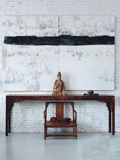条案是礼仪性很强的家具,陈设非常灵活,明清时期人们常将其设于正厅之内,上配中堂,前配方桌、对椅,侧间设案者多位于窗前或山墙处,上置花瓶、座钟和梳妆用具等物品,特别是书斋、画室、闺阁、佛堂等高雅场合更为多见,其上或摆书函、文具,或放画轴、字帖,或陈鼎彝雅物,或置香薰、拂尘等,旨在与室内装潢和其他家具协调统一,从而形成高雅和谐的布局效果。