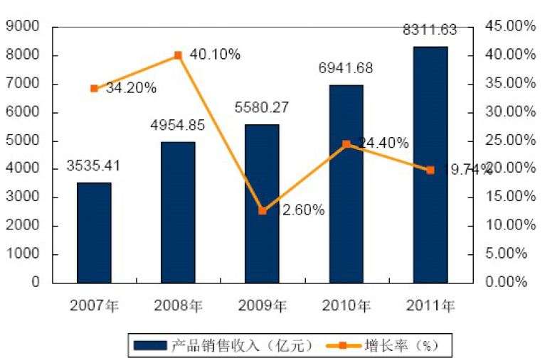 行业经营效益方面,根据中国重型机械工业协会披露的数据,2011年,我国重型机械行业工业总产值8686.1亿元,同比增长26.2%;工业销售产值8461.3亿元,同比增长27%;出口金额139.6亿美元,同比增长20.4%;进口额68.9亿美元,同比增长15.7%;进出口顺差70.76亿美元,同比增长36.9%;利润额584.5亿元,同比增长23.9%。就分行业而言,冶金机械工业销售产值1019.3亿元,同比增长12.3%;出口额15.8亿美元,同比增长10.8%。以冶金设备为主的明显下滑。矿山机械工业销售产值2766.7亿元,同比增长33.75%;出口额14.43亿美元,同比增长54%。采掘设备、筛分洗选设备、钻机、矿山卷扬设备、矿山机械零件出口增长均超过40%,但破碎粉磨设备出口额下滑较大,同比下降47.13%。
